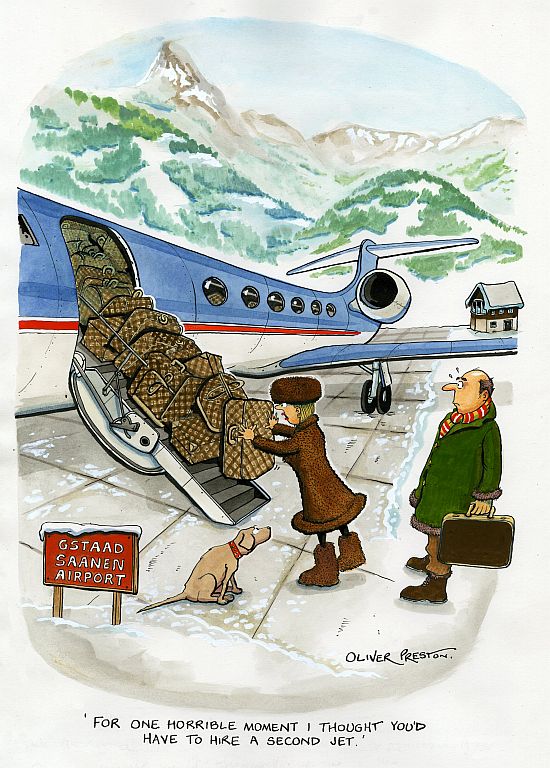 Im Sommer ist es noch viel lustiger, wenn nämlich die Bauern ihre geschmückten Kühe durch die Promenade führen! Oder während des Polo-Turnieres, wenn sich die Polo-Equipe auf ihren wunderschönen Pferden auf der Promenade zeigt, begrüßt von den Geschäften mit einem Apéro (Weißwein und Hobelkäse… lecker!). Einer der ein gutes Gespür für die Situation in Gstaad hat, ist Oliver Preston. Mit seinen amüsanten und gut beobachteten Cartoons bringt er die
